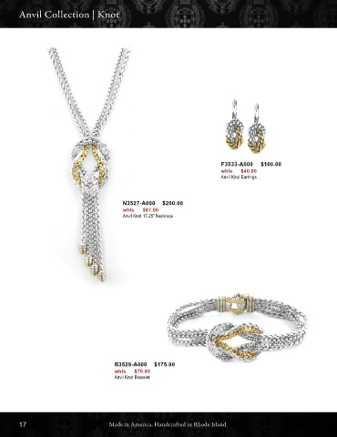 Anvil Collectionnvil Collection | Knot A F3533-A000 $100.00 whls $40.00 Anvil Knot Earrings N3527-A000 $200.00 whls $87.00 Anvil Knot 17.25” Necklace B3529-A000 $175.00 whls $70.00 Anvil Knot Bracelet 17 Made in America. Handcrafted in Rhode Island.
