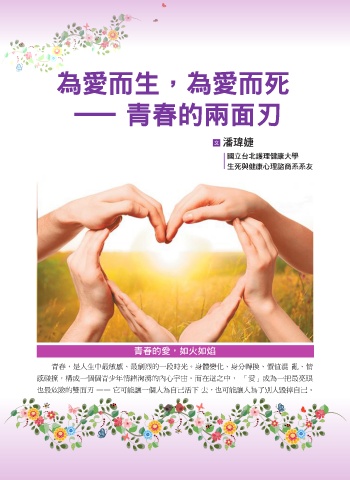 Aug.2025 為愛而生,為愛而死 —— 青春的兩面刃 潘瑋婕 文 國立台北護理健康大學 生死與健康心理諮商系系友 青春的愛,如火如焰 青春,是人生中最敏感、最劇烈的一段時光。身體變化、身分轉換、價值混 亂、情 感碰撞,構成一個個青少年情緒洶湧的內心宇宙。而在這之中, 「愛」成為一把最亮眼 也最危險的雙面刃 —— 它可能讓一個人為自己活下 去,也可能讓人為了別人毀掉自己。 48