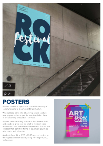 Posters have the ability to stick in the viewers mind and can be a great tool for small to medium sized businesses to increase brand awareness. Posters are cheaper than common forms of advertising such as print, radio and television.