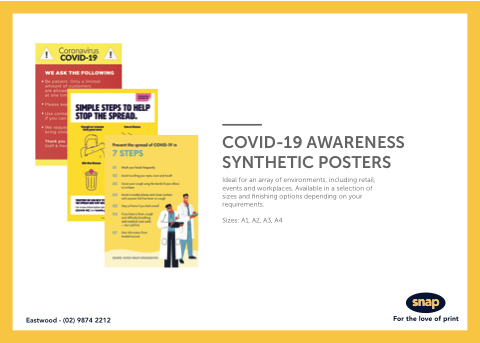 COVID-19 AWARENESS SYNTHETIC POSTERS Ideal for an array of environments, including retail, events and workplaces. Available in a selection of sizes and finishing options depending on your requirements. Sizes: A1, A2, A3, A4 Eastwood - (02) 9874 2212