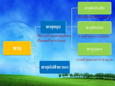 พายุดีเปรสชัน ความเร็วลมไม่เกิน 6 km./hr พำยุหมุน พายุโซนร้อน ใช้ความเร็วลมรอบศูนย์กลาง ความเร็วลม63-118 km./hr เป็นเกณฑ์ในการจ าแนก พำยุ พายุรุนแรง ความเร็วลมมากกว่า118 km./hr พำยุฝนฟ้ ำคะนอง