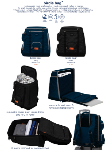full length zippers in the back for easy packing of inserts • removable laptop sleeve • comfort straps trolley sleeve on backside of bag to slide over luggage handles so your bag remains balanced on a wheeled bag water and stain resistant • 15” x 9.5” x 17.5” • 5 external pockets • padded top handle • easy top access