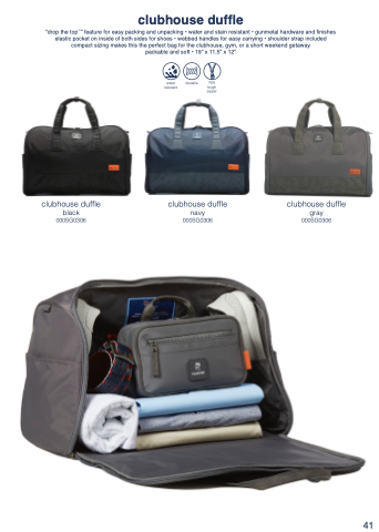 “drop the topTM” feature for easy packing and unpacking • water and stain resistant • gunmetal hardware and finishes elastic pocket on inside of both sides for shoes • webbed handles for easy carrying • shoulder strap included compact sizing makes this the perfect bag for the clubhouse, gym, or a short weekend getaway
