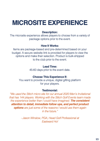 “We used the Stitch micro site for our annual 2020 Men’s Invitational that has 144 players. Working with the Stitch Golf Events team made the experience better than I could have imagined. The consistent attention to detail, immediate follow ups, and perfect product options are just some of the reasons I would use them again