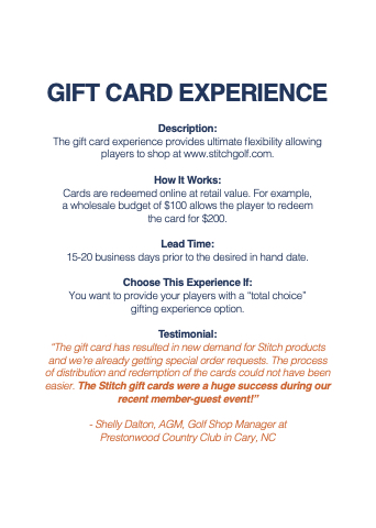 The gift card experience provides ultimate flexibility allowing players to shop at www.stitchgolf.com.
