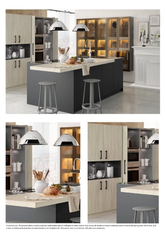Cocina Luna. Funcionalidad y diseño son las constantes que se reflejan en esta cocina. Los tonos de madera claras resaltan sobre el acabado gris plomo de la isla, que