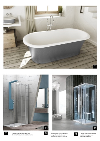 7 8 9 7 Classic. matelial Solid Sanycces. 8 Mamparas de ducha de cristal 9 Cabina de ducha de bienestar Opcional: Tratamiento antideslizante con perfiles brillantes que multifuncional para su mejoran su elegante estética. comodidad y belleza.