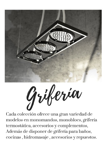 Grifería Cada colección ofrece una gran variedad de modelos en monomandos, monoblocs, grifería termostática, accesorios y complementos, Además de disponer de grifería para baños, cocinas , hidromasaje , accesorios y repuestos.