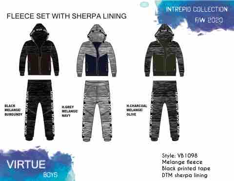 FLEECE SET WITH SHERPA LINING iNtRePiD CoLlEcTiOn F/W 2020 BLACK MELANGE/ BURGUNDY H.GREY MELANGE/ NAVY H.CHARCOAL MELANGE/ OLIVE VIRTUE bOyS Style: VB1098 Melange fleece Black printed tape DTM sherpa lining