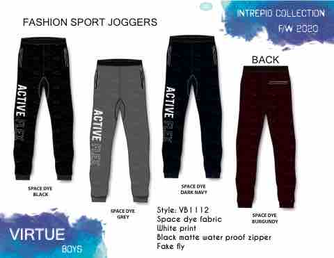 FASHION SPORT JOGGERS SPACE DYE BLACK VIRTUE bOyS iNtRePiD CoLlEcTiOn F/W 2020 BACK ACTIVE ACTIVE ACTIVE SPACE DYE GREY Style: VB1112 Space dye fabric White print Black matte water proof zipper Fake fly SPACE DYE DARK NAVY SPACE DYE BURGUNDY