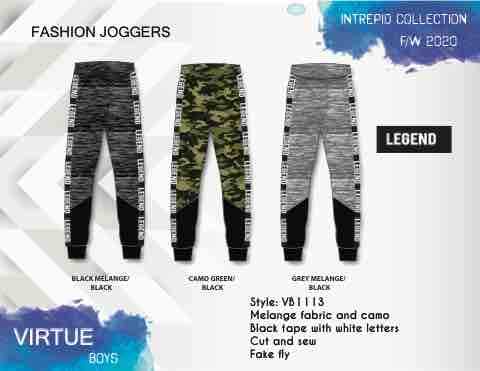 FASHION JOGGERS BLACK MELANGE/ BLACK VIRTUE bOyS CAMO GREEN/ BLACK iNtRePiD CoLlEcTiOn F/W 2020 GREY MELANGE/ BLACK Style: VB1113 Melange fabric and camo Black tape with white letters Cut and sew Fake fly