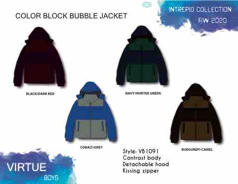 COLOR BLOCK BUBBLE JACKET iNtRePiD CoLlEcTiOn F/W 2020 BLACK/DARK RED NAVY/HUNTER GREEN COBALT/GREY Style: VB1091 Contrast body Detachable hood Kissing zipper BURGUNDY/CAMEL VIRTUE bOyS
