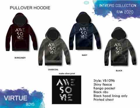 PULLOVER HOODIE iNtRePiD CoLlEcTiOn F/W 2020 BLACK Style: VB1096 Shiny fleece Kango pocket Black ribs Black hood lining only Printed chest BURGUNDY NAVY VIRTUE bOyS CHARCOAL matte silver print