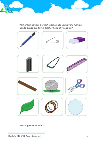 Perhatikan gambar berikut. Apakah ada usaha yang menjual benda-benda berikut di sekitar tempat tinggalmu? Amati gambar di atas ! IPA Kelas VI SD/MI Tema 5 Semester 1 24