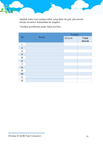 Apakah kamu bisa memprediksi yang akan terjadi jika benda- benda tersebut didekatkan ke magnet. Tuliskan prediksimu pada tabel berikut. Prediksi No Benda Ditarik Tidak ditarik 1 2 3 4 5 6 7 8 9 10 11 12 IPA Kelas VI SD/MI Tema 5 Semester 1 25