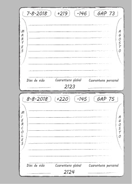 7-8-2018 +219 -146 GAP 73 MARTES AGOSTO Días de vida Cuarentena global Cuarentena personal 2123 8-8-2018 +220 -145 GAP 75 MIERCOLES AGOSTO Días de vida Cuarentena global Cuarentena personal 2124