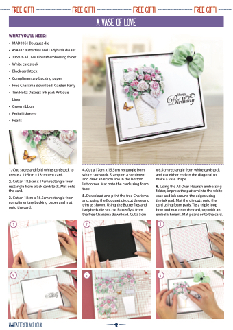 5. Download and print the free Charisma and, using the Bouquet die, cut three and trim as shown. Using the Butterflies and Ladybirds die set, cut Butterfly 4 from