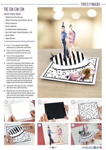 4. Using the Greeting Card Platform die set, cut two Doily Oval 2 from white and black cardstock. Cut Doily Oval 1 from complimentary backing paper and Base from black cardstock. Cut the Centre Slot into the backing paper oval. Reinforce the score lines of the Base and valley fold. Mat the die cuts onto the card and slot the backing paper oval into the top of the base.