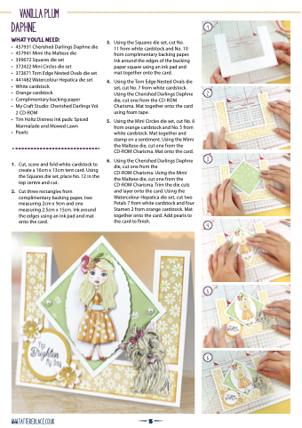 CD-ROM Charisma. Using the Mimi the Maltese die, cut one from the CD-ROM Charisma. Trim the die cuts and layer onto the card. Using the Watercolour Hepatica die set, cut two Petals 7 from white cardstock and four Stamen 2 from orange cardstock. Mat together onto the card. Add pearls to the card to finish.