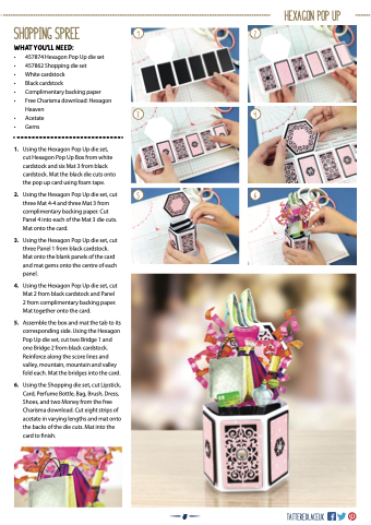 3. Using the Hexagon Pop Up die set, cut three Panel 1 from black cardstock. Mat onto the blank panels of the card and mat gems onto the centre of each panel.