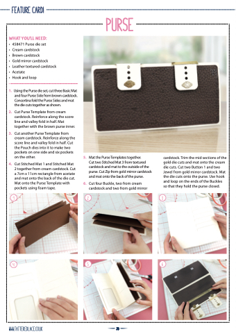 cardstock. Trim the mid sections of the gold die cuts and mat onto the cream die cuts. Cut two Button 1 and two Jewel from gold mirror cardstock. Mat the die cuts onto the purse. Use hook and loop on the ends of the Buckles so that they hold the purse closed.