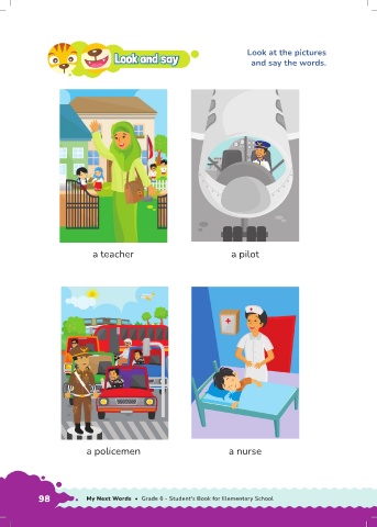 Look at the pictures Look and say Look and say Look and say Look and say and say the words. a teacher a pilot a policemen a nurse 98 My Next Words • Grade 6 - Student's Book for Elementary School
