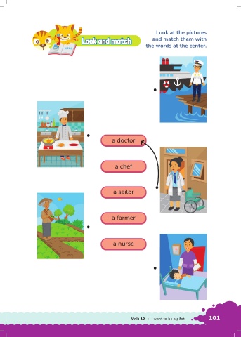 Look at the pictures Look and match Look and match Look and match and match them with Look and match the words at the center. a doctor a chef a sailor a farmer a nurse Unit 10 • I want to be a pilot 101
