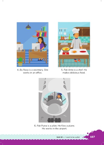 4. Bu Rosa is a secretary. She 5. Pak Anto is a chef. He works in an office. makes delicious food. 6. Pak Putra is a pilot. He flies a plane. He works in the airport. Unit 10 • I want to be a pilot 107
