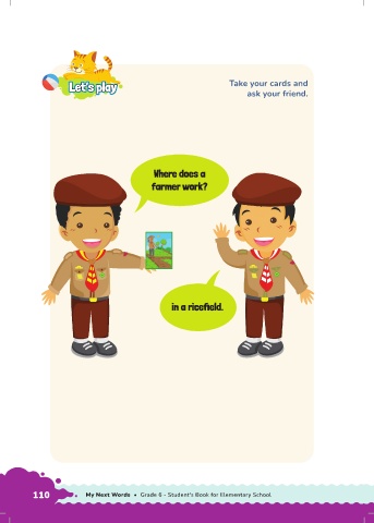 s play t’ s play s play t’ Let’s play Take your cards and Le Le Le t’ ask your friend. Where does a farmer work? in a ricefield. 110 My Next Words • Grade 6 - Student's Book for Elementary School