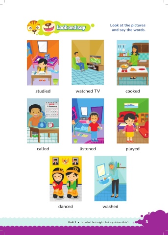 Look and say Look and say Look and say Look and say Look at the pictures and say the words. studied watched TV cooked called listened played danced washed Unit 1 • I studied last night, but my sister didn’t 3