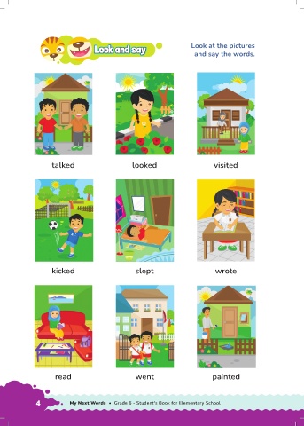 Look and say Look at the pictures Look and say Look and say Look and say and say the words. talked looked visited kicked slept wrote read went painted 4 My Next Words • Grade 6 - Student's Book for Elementary School