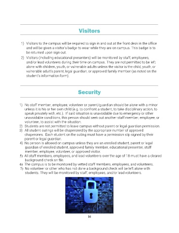 6) The campus is to be monitored by vetted staff members, employees, and volunteers.