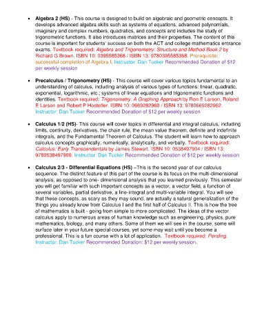 • Calculus 1/2 (HS)- This course will cover topics in differential and integral calculus, including