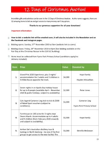 Incredible gifts and activities can be won in the 12 Days of Christmas Auction. As the name suggests, there are