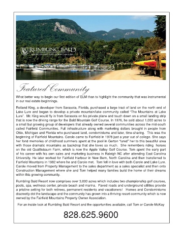 Fairfield Mountains in 1982 where he and Carole met. Tom fell in love with both Carole and Lake Lure.