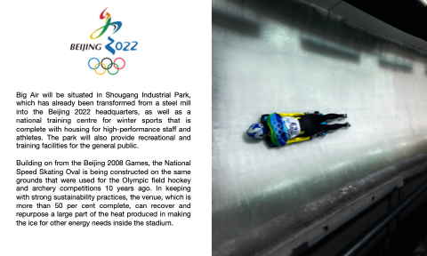 Big Air will be situated in Shougang Industrial Park, which has already been transformed from a steel mill into the Beijing 2022 headquarters, as well as a national training centre for winter sports that is complete with housing for high-performance staff and athletes. The park will also provide recreational and training facilities for the general public.