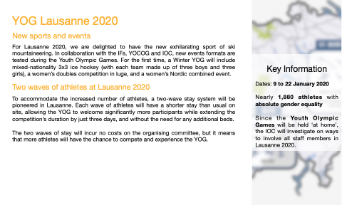 For Lausanne 2020, we are delighted to have the new exhilarating sport of ski mountaineering. In collaboration with the IFs, YOCOG and IOC, new events formats are tested during the Youth Olympic Games. For the first time, a Winter YOG will include mixed-nationality 3x3 ice hockey (with each team made up of three boys and three girls), a women’s doubles competition in luge, and a women’s Nordic combined event.
