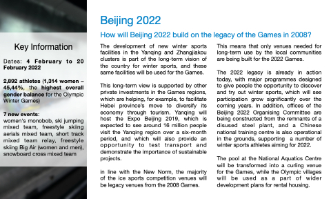 This long-term view is supported by other private investments in the Games regions, which are helping, for example, to facilitate Hebei province’s move to diversify its economy through tourism. Yanqing will host the Expo Beijing 2019, which is expected to see around 16 million people visit the Yanqing region over a six-month period, and which will also provide an opportunity to test transport and demonstrate the importance of sustainable projects.
