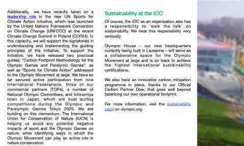 Of course, the IOC as an organisation also has a responsibility to ‘walk the talk’ on sustainability. We treat this responsibility very seriously.