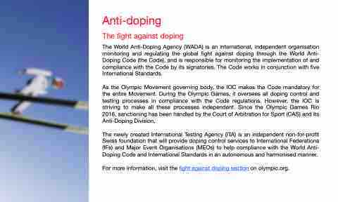 As the Olympic Movement governing body, the IOC makes the Code mandatory for the entire Movement. During the Olympic Games, it oversees all doping control and testing processes in compliance with the Code regulations. However, the IOC is striving to make all these processes independent. Since the Olympic Games Rio 2016, sanctioning has been handled by the Court of Arbitration for Sport (CAS) and its Anti-Doping Division.