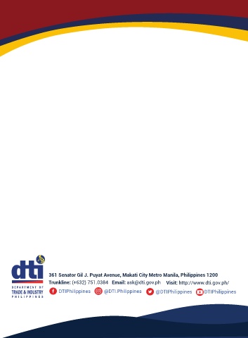 361 Senator Gil J. Puyat Avenue, Makati City Metro Manila, Philippines 1200 Trunkline: (+632) 751.0384 Email: ask@dti.gov.ph Visit: http://www.dti.gov.ph/ DTIPhilippines @DTI.Philippines @DTIPhilippines DTIPhilippines