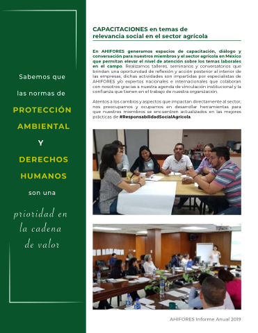 En AHIFORES generamos espacios de capacitación, diálogo y conversación para nuestros miembros y el sector agrícola en México que permitan elevar el nivel de atención sobre los temas laborales en el campo. Realizamos talleres, seminarios y conversatorios que brindan una oportunidad de reflexión y acción posterior al interior de las empresas, dichas actividades son impartidas por especialistas de AHIFORES y/o expertos nacionales e internacionales que colaboran con nosotros gracias a nuestra agenda de vinculación institucional y la confianza que tienen en el trabajo de nuestra organización.