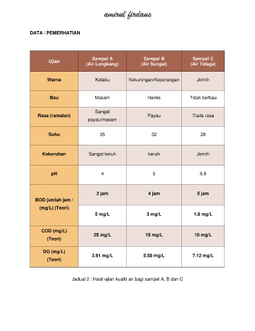 Jadual 2 : Hasil ujian kualiti air bagi sampel A, B dan C