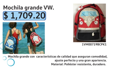 Mochila grande VW. $ 1,709.20 1VM00719BCPK1 Mochila grande con características de calidad que aseguran comodidad, ajuste perfecto y una gran apariencia. Material: Poliéster resistente, duradero.