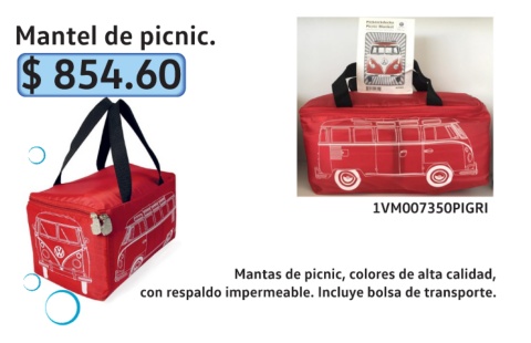 Mantel de picnic. $ 854.60 1VM007350PIGRI Mantas de picnic, colores de alta calidad, con respaldo impermeable. Incluye bolsa de transporte.