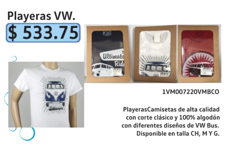 Playeras VW. $ 533.75 1VM007220VMBCO PlayerasCamisetas de alta calidad con corte clásico y 100% algodón con diferentes diseños de VW Bus. Disponible en talla CH, M Y G.