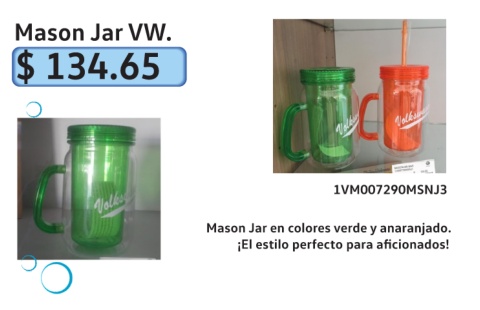 Mason Jar VW. $ 134.65 1VM007290MSNJ3 Mason Jar en colores verde y anaranjado. ¡El estilo perfecto para aficionados!