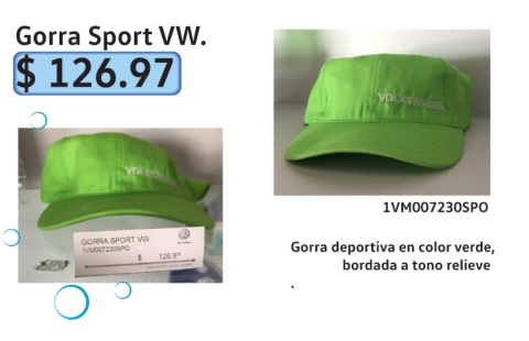 Gorra Sport VW. $ 126.97 1VM007230SPO Gorra deportiva en color verde, bordada a tono relieve .