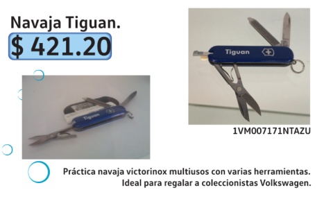 Navaja Tiguan. $ 421.20 1VM007171NTAZU Práctica navaja victorinox multiusos con varias herramientas. Ideal para regalar a coleccionistas Volkswagen. .