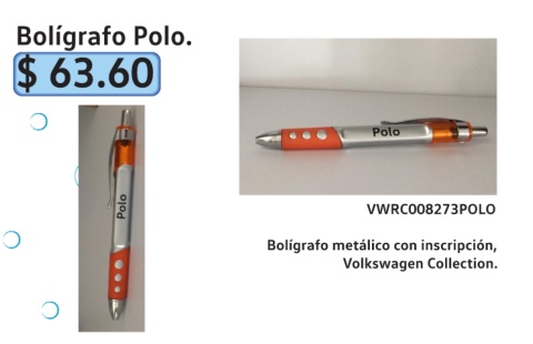 Bolígrafo Polo. $ 63.60 VWRC008273POLO Bolígrafo metálico con inscripción, Volkswagen Collection.